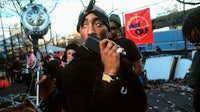 Tupac Shakur speaks on a cell phone in the set of the movie “Above the Rim”